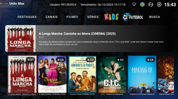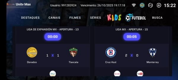 • ✅ Main menu with sections: Highlights, Channels, Movies, Series, Kids, Soccer and Search.